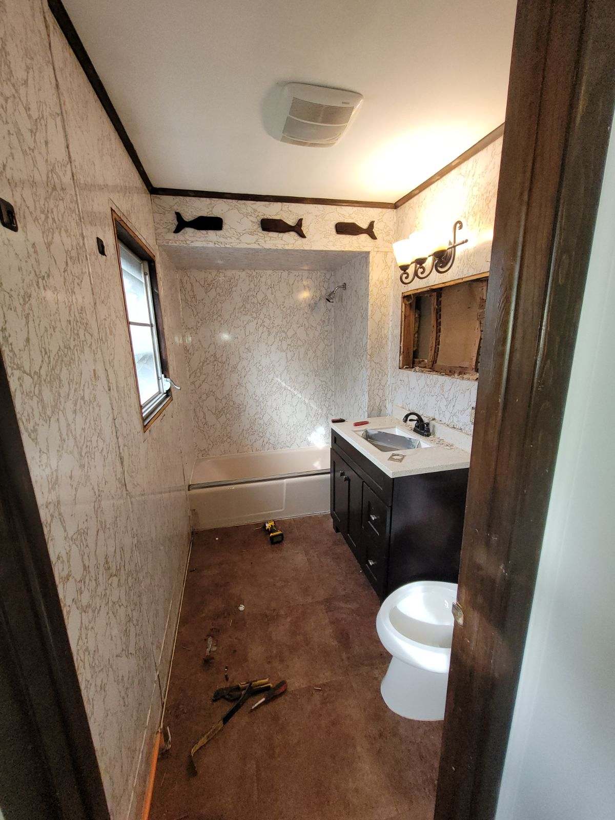 This clever transformation maximizes a small space by replacing dated textures with elegant marble-patterned tiling. A modern dark vanity gives a sophisticated and functional refresh.