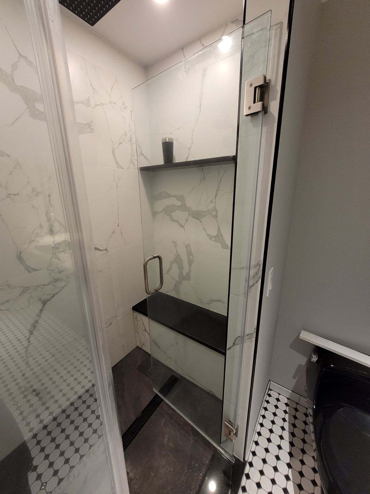 This high end shower has floor to ceiling marbled porcelain with bold matte black accents. Enjoy a rainfall showerhead, custom built-in bench, and a seamless glass enclosure for a sophisticated spa experience.